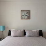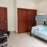 The master bedroom boasts a luxurious King size bed, an ensuite full bathroom, a smart TV, a generously-sized closet, and direct access to the inviting pool area. The second bedroom offers a cozy queen size bed, a closet, and convenient access to the pool as well. The third bedroom is perfect for accommodating children or guests, with a twin-over full-size bunk bed, a closet, and a desk for studying or working. These two bedrooms share a well-appointed full bathroom.